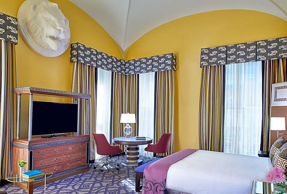 Featuring floor-to-ceiling windows with ornate molding, this suite features a marble bathroom with a claw bath.